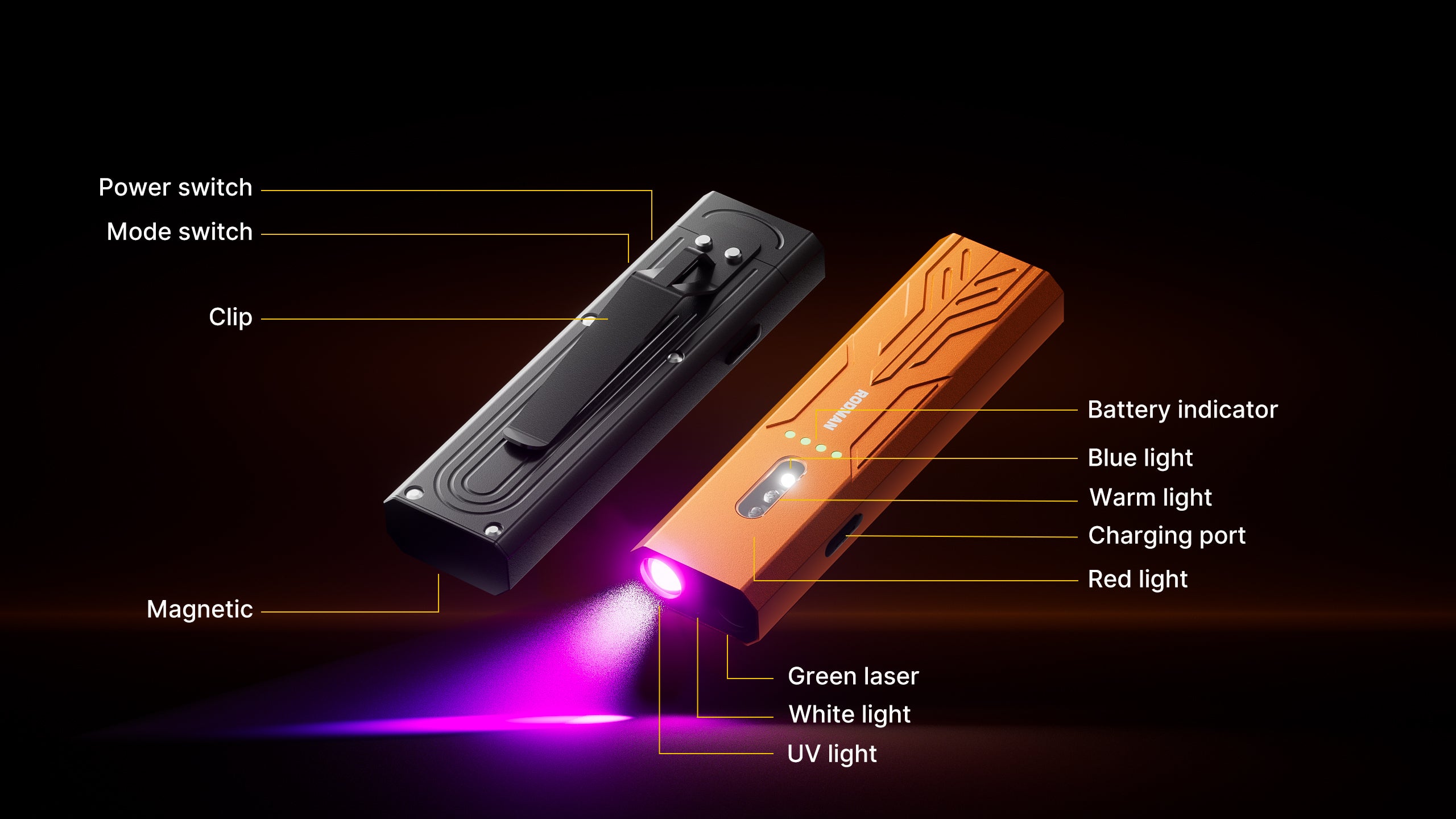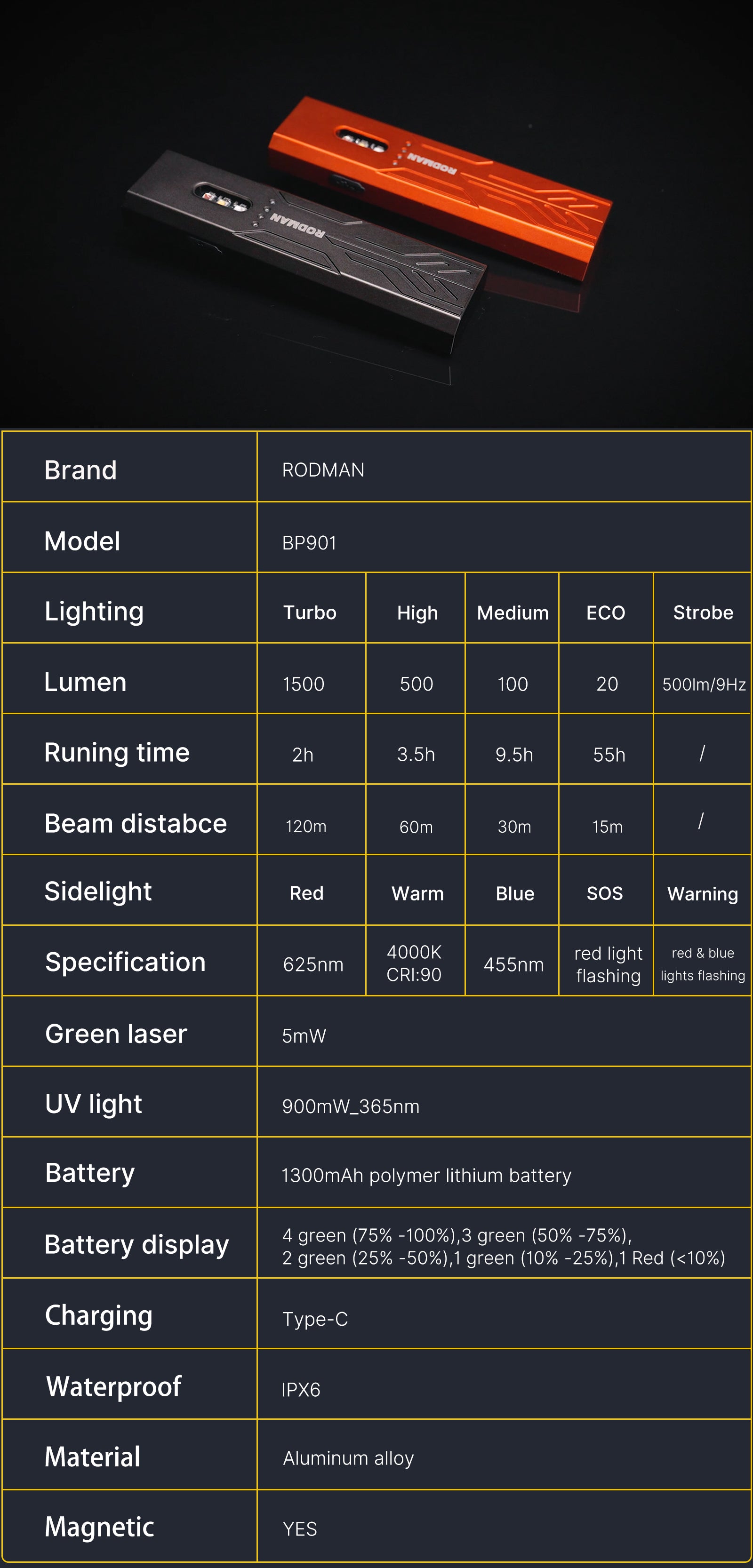 With a simple slide of the side switch, you can choose exactly the light you need — white, UV, green laser, red, blue, warm light, or a warning signal. Whether it’s for daily use, hiking trips, or any other lighting needs, the BP901 is designed to be your reliable companion, ready to adapt to any situation.
