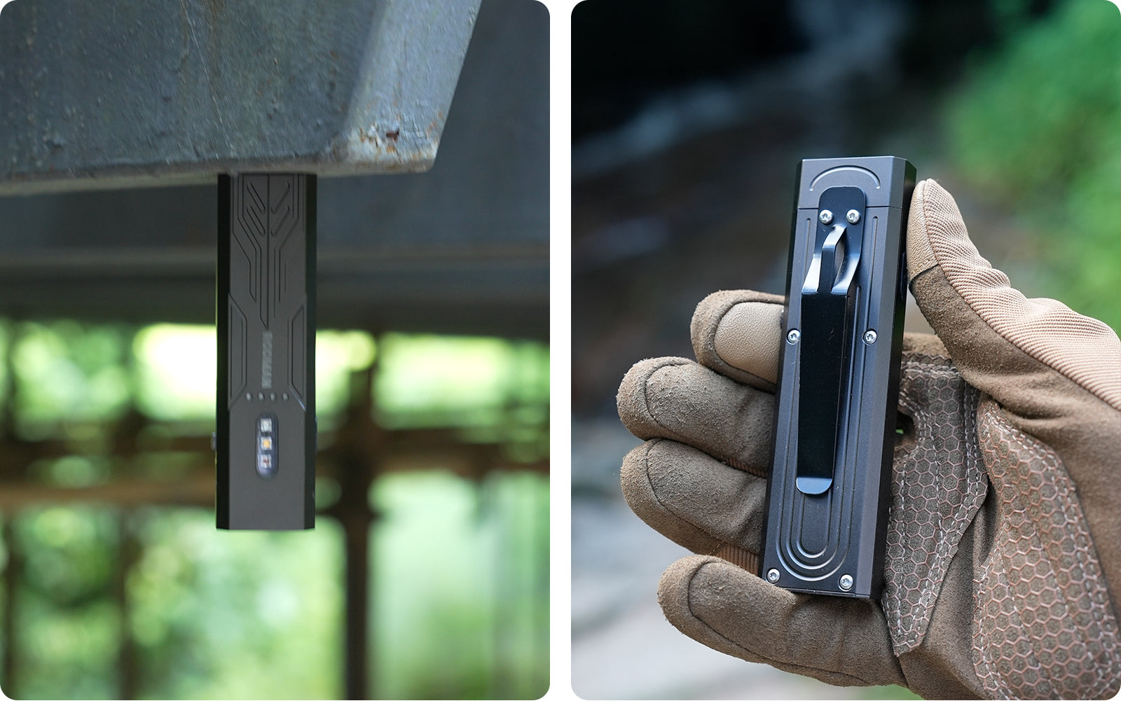 When no metal surfaces are nearby or you need portable lighting, simply use the built-in clip to attach the flashlight to your clothing or hat for convenient, hands-free illumination.